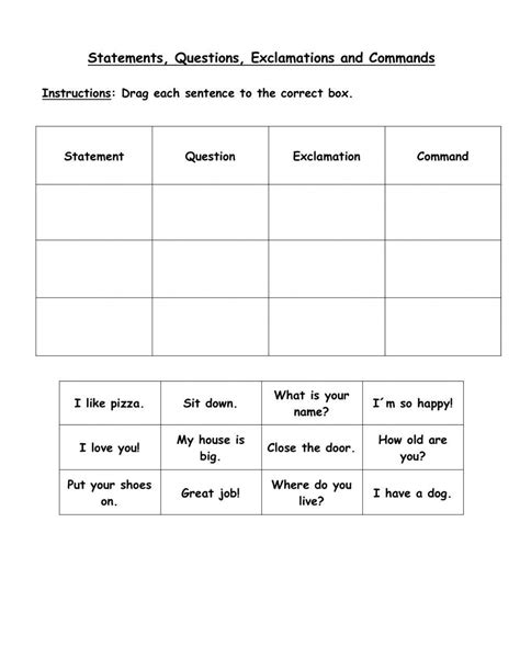 Statements questions commands exclamations 3. Some of the worksheets for this concept are types of sentence, g r a m m. Web your students will learn to use a period, a question mark, and an exclamation mark according to each kind of sentence (statement, question, command, and.